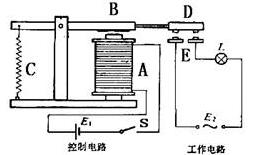 電磁繼電器的構造:如圖所示,a是電磁鐵,b是銜鐵,c是彈簧,d是動觸點,e是靜觸點。電磁繼電器工作電路可分為低壓控制電路和高壓工作電路組成。控制電路是由電磁鐵a、銜鐵b、低壓電源e1和開關組成;工作電路是由小燈泡l、電源e2和相當于開關的靜觸點、動觸點組成。連接好工作電路,在常態時,d、e間未連通,工作電路斷開。用手指將動觸點壓下,則d、e間因動觸點與靜觸點接觸而將工作電路接通,小燈泡l發光。閉合開關s,銜鐵被電磁鐵吸下來,動觸點同時與兩個靜觸點接觸,使d、e間連通。這時彈簧被拉長,觀察到工作電路被接通,小燈泡l發光。斷開開關s,電磁鐵失去磁性,對銜鐵無吸引力。銜鐵在彈簧的拉力作用下回到原來的位置,動觸點與靜觸點分開,工作電路被切斷,小燈泡l不發光。